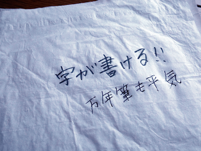 乾いたら半紙のような質感になったので、字を書いてみる。滲まず、破けずに書けるぞ!細字の万年筆もへっちゃらだ。