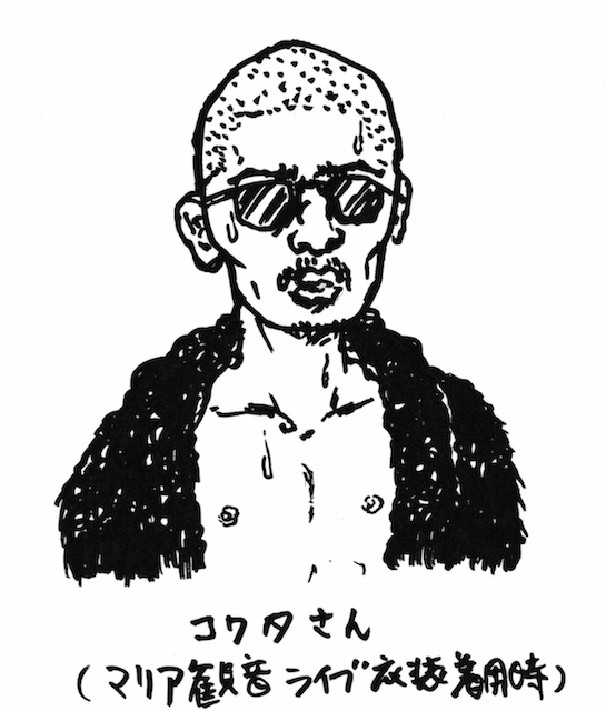 マリア観音は、演歌とパンクとプログレとエアロビクスを合体させ、そのどれをも完膚なきまでに超える存在になろうという、死ぬ気で本気の試みだった。坊主+ヒゲ+サングラスという頭にヤの付くこわい職業の人にしか見えないボーカルのコワタさんが、下半身はチャコットのレオタードに存在感のある性器をしっとりと忍ばせ、素肌にミンクのハーフコートを纏って己の乳首を愛撫しながら、昭和50年の小柳ルミ子よりも軽やかなステップで跳躍。スーツに開襟シャツ&長髪&ヒゲといういにしえの香港映画の悪役のような身なりのマツイさんと時折舌を絡めながら、慟哭と歌声の中間の絶唱を叩きつけるすごいバンドである。三条友美と石井隆の煮えたぎるエロスを感じさせる歌詞も含め、一度見ただけで完全にもっていかれ、すぐさま虜になった。メンバー全員のルックスが、70年代のゴールデンハーベストの映画に出てくるマフィアとカンフーの使い手をどちらも兼任したようないかがわしさとあやしさで、俺にとってこれほど完璧なバンドはないと思えた。